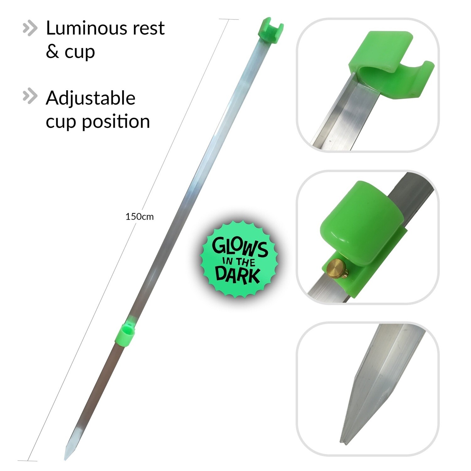 One rod V sand spike. Main body with luminous rest and luminous cup attached. The cup that holds the rod butt can be adjusted to suit the anglers preferred position.